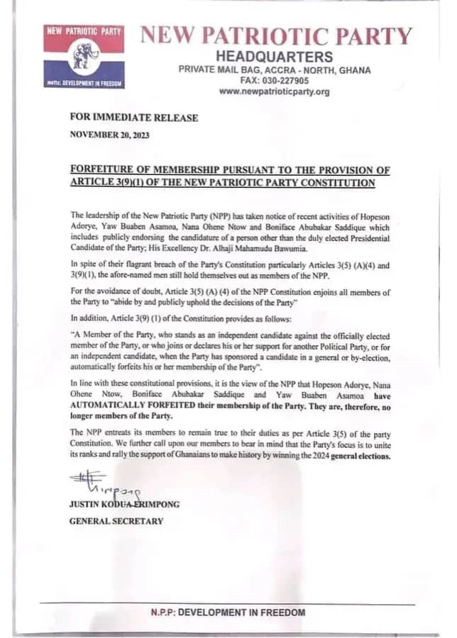 Prior to the 2024 elections, and subsequently after the party’s overwhelming defeat, several leaders of the party have discussed such issues, bordering on leadership struggles and succession disputes, shifts in political dynamics, policy disagreements and factionalism, as creating mayhem within the party. The exit and secession of key leaders and members, different factions vying for control, and issues of succession and leadership have all led to in-fighting, internal blame games, tensions and erosion of confidence among ordinary supporters. The failure of the NPP government under President Nana Addo Dankwa Akufo-Addo to deliver key dividends issuing from electoral promises further created a poisoned environment ripe for internal dissatisfaction and disaffection.